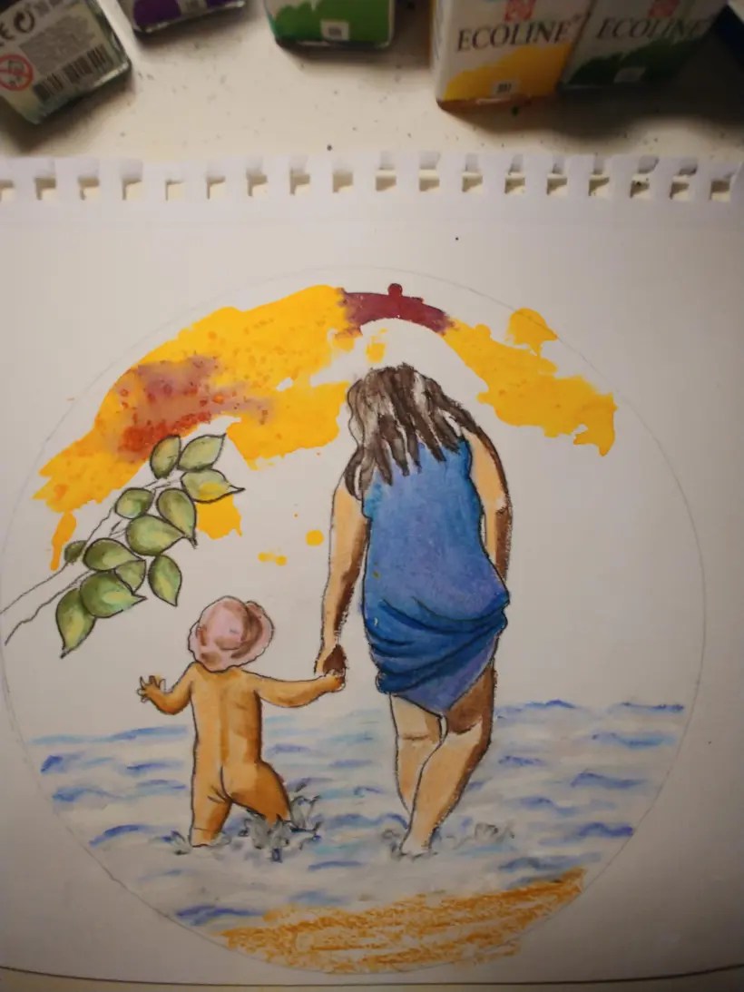 Encore exploration aquarelle et pastels a l’huile. J’aime le contraste vif entre le ciel jaune et plein de lumière et le bleu de l’eau. Je dois trouver moyen de lier le ciel et l’eau …mes explorations me sont pas garanties!! Mais j’y vais une étape a la fois, sans trop savoir, mais c’est agréable car cette image représente ma petite fille Alys et moi qui allons jouer dans l’eau. Et je me retrouve dans cette ambiance agréable et douce par le dessin.