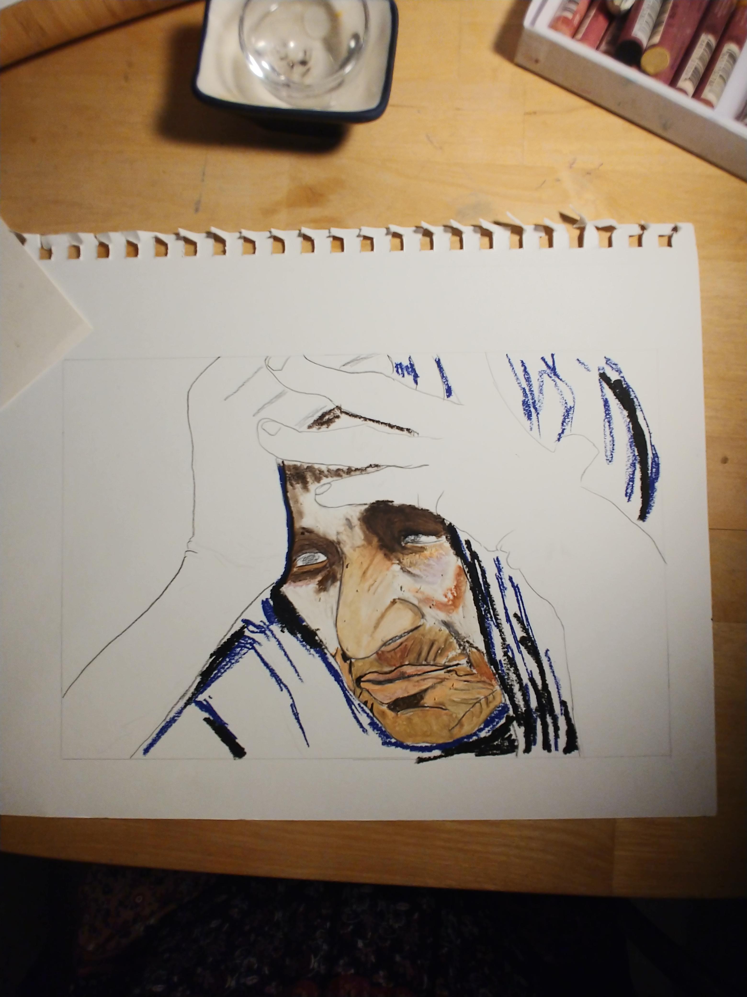 Je ne vois pas comment illustrer le désespoir de manière plus vraie. Comme je dois beaucoup observer la photo pour mettre les couleur et les formes, j’ai eu l’impression d’être assise à côté de cette femme qui semble vouloir se cacher les yeux avec les mains et d’entendre son cœur tellement trop lourd.