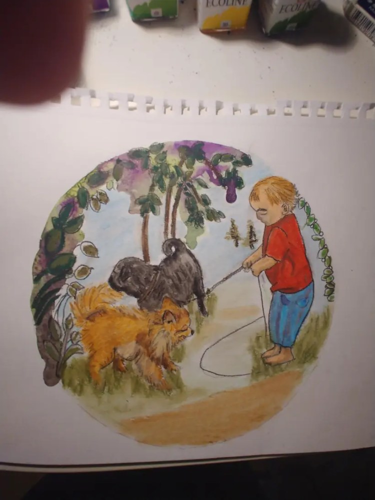 Il reste encore quelques détails à terminer, mais j’aime bien le mélange d’aquarelle et de pastels à l’huile. J’ai l’impression que cela ajoute une dimension onirique au dessin.