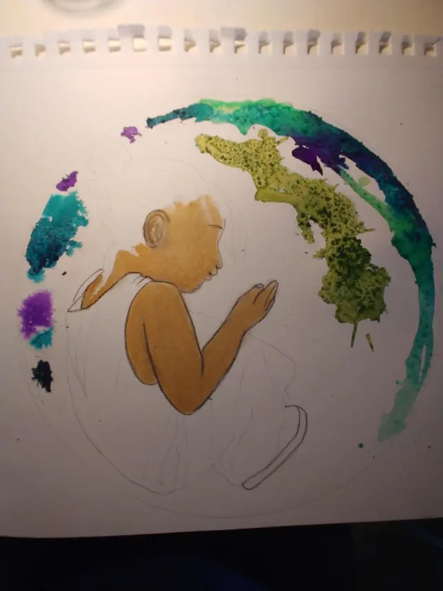 J’ai choisi une photo que j’avais prise de ma petite-fille Olivia qui examinait un petit quelque chose qu’elle avait au bout du doigt. Je suis encore émue devant ce petit moment d infini…j’adore l’attention que l enfant porte à cette goutte d’eau…c est un espace-temps rempli d’une attention totale. J’ai commencé en faisant un fond à l’aquarelle. Cela sera le fond du feuillage qui devrait se dessiner dans ce coin-là. Les couleurs sont profondes et brillantes, c’est un peu comme le cosmos et cela me fait plaisir. Me lancer dans la couleur est toujours un peu comme se jeter à l’eau…c’est excitant et épeurant un peu en même temps…mais j’aime me lancer à l eau et la couleur me fait souvent de belles surprises…
