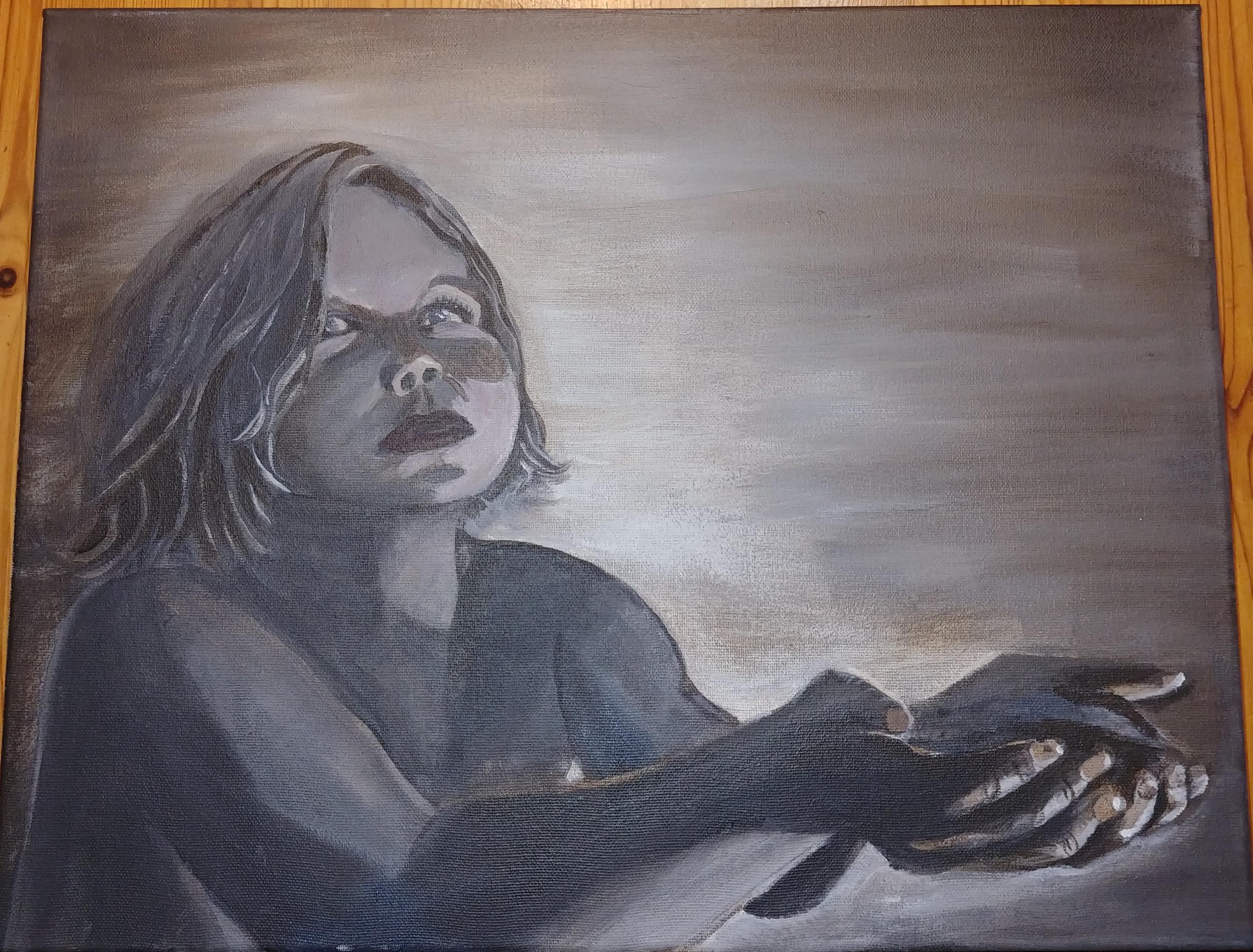 Voici une image dessinée et peinte (pastels à l’huile, huile et pinceau avec touches de crayons de couleur polychromos de Faber-Castel) à partir d’un photo que j’ai prise de mes petites-filles jouant dans le jardin. Elles s’imaginaient qu’elles étaient pauvres et qu’elles devaient ramener de l’eau à la maison. Elles avaient rempli un seau d’eau et dans la série de photos que j’ai prise, je me suis arrêtée sur celle-ci que j’aimais beaucoup.
